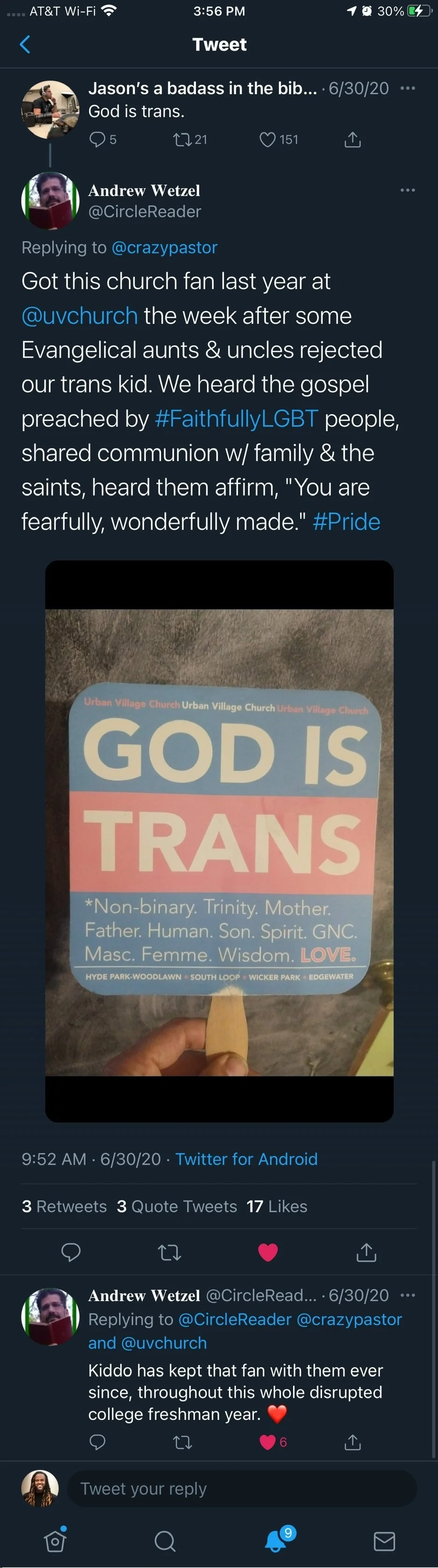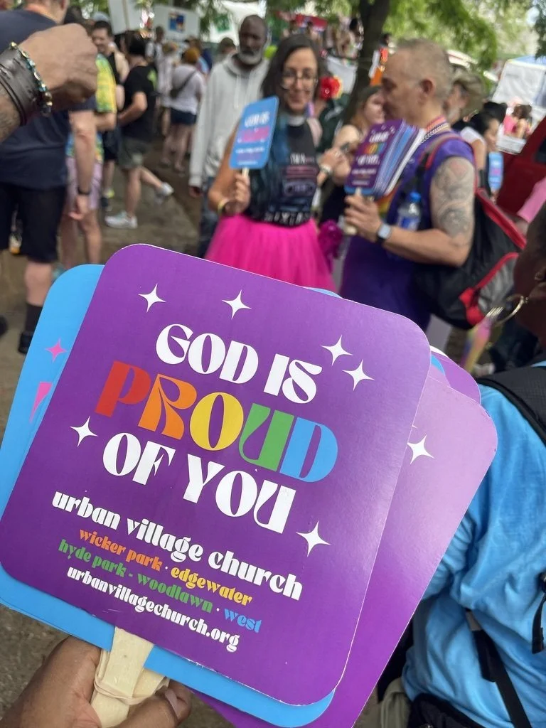 You might have seen Urban Village Church members waving fans in the Chicago Pride Parade that proclaimed “God is Trans”. What do we mean by that statement? We are not trying to be intentionally provocative to people who disagree with Trans Rights, nor are we teaching that God is in the journey of transitioning. Instead, we are proclaiming the radical inclusivity, grace, and love of God. Here is what we mean: